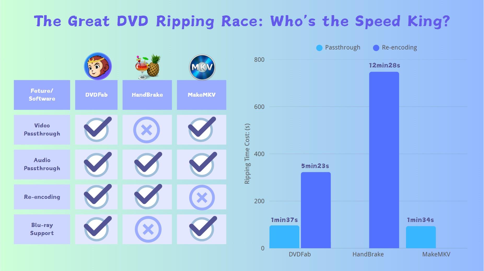 DVDFab DVD Ripper is a fast, flexible choice. You can use passthrough to keep the original video and audio, or re-encode to shrink the file while keeping the picture clean. Hardware acceleration speeds the job, and you still control codec, bitrate, audio, and subtitles. MakeMKV prioritizes speed by skipping re-encoding altogether, which makes it ideal for quick backups—but the tradeoff is massive file sizes due to uncompressed output. HandBrake, while strong in re-encoding efficiency, lacks a true passthrough option for video, which can limit its adaptability depending on the user's needs.