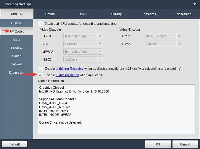 It's easy: Open Common Settings panel via the gear icon at the top right corner of DVDFab 9 newest version, navigate to General>A/V Codec, and then mark the option of "Enable Lightning-Shrink when applicable". Next, click the "OK" button on that window and restart DVDFab 9 so that the settings shall take effect.