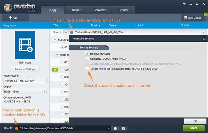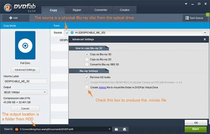 Blu-ray Copy: when copying a physical Blu-ray disc to computer as movie folder, or copy an existing Blu-ray folder to another folder in and only in the Full Disc and Main Movie modes, an extra option of creating .miniso files will be available at the Advanced Settings panel.